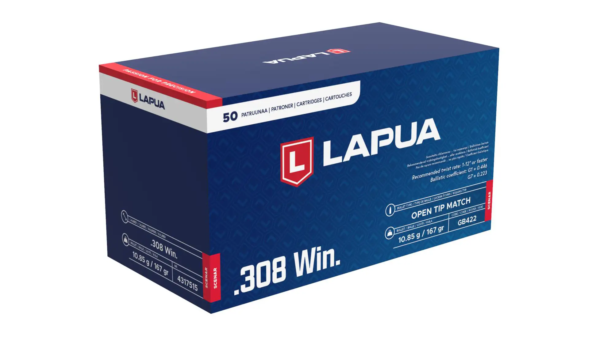 Product Info for Lapua Scenar .308 Winchester 167 grain Scenar Open Tip Match Brass Cased Centerfire Rifle Ammunition
