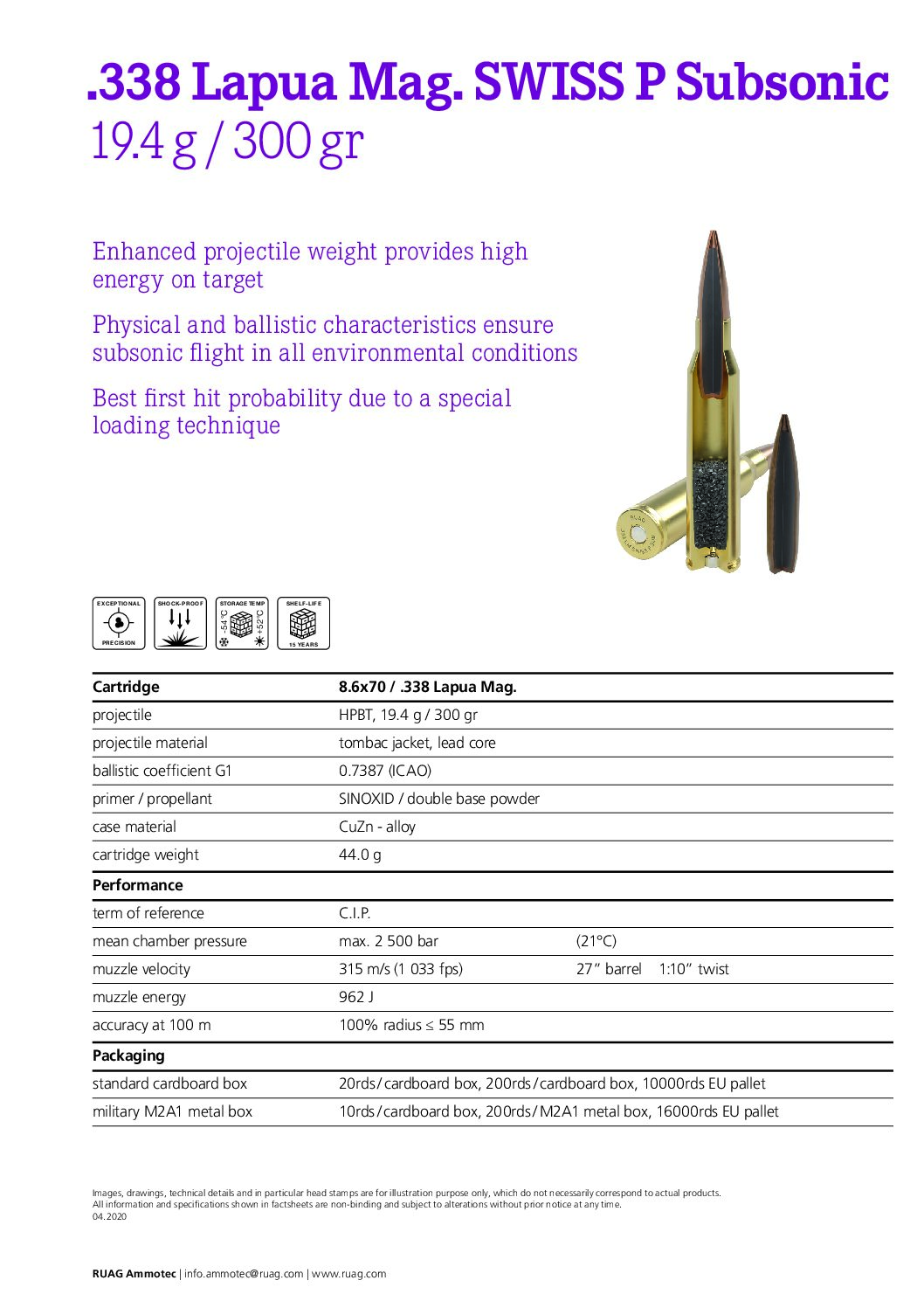 The .338 Lapua Mag. SWISS P Subsonic is also available with a 16.2 g / 250 gr bullet. CLICK HERE