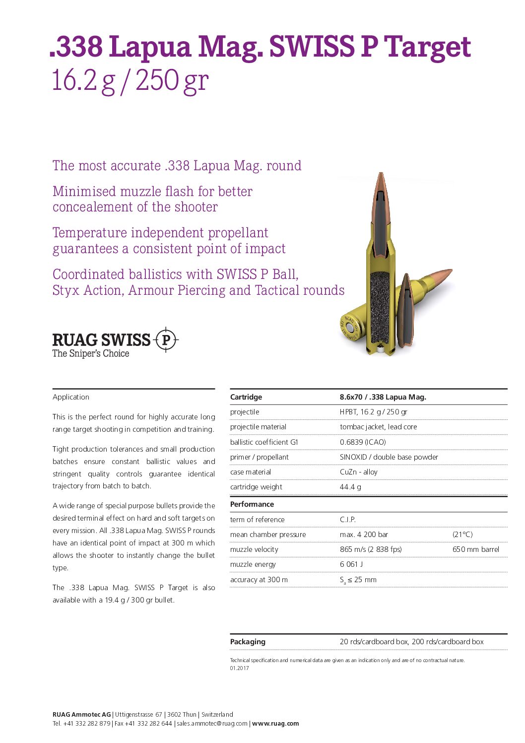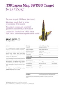 The .338 Lapua Mag. SWISS P Target is also available with a 19.4 g / 300 gr bullet. CLICK HERE